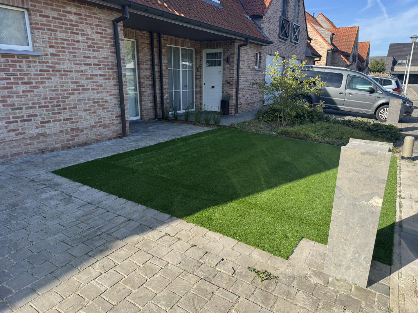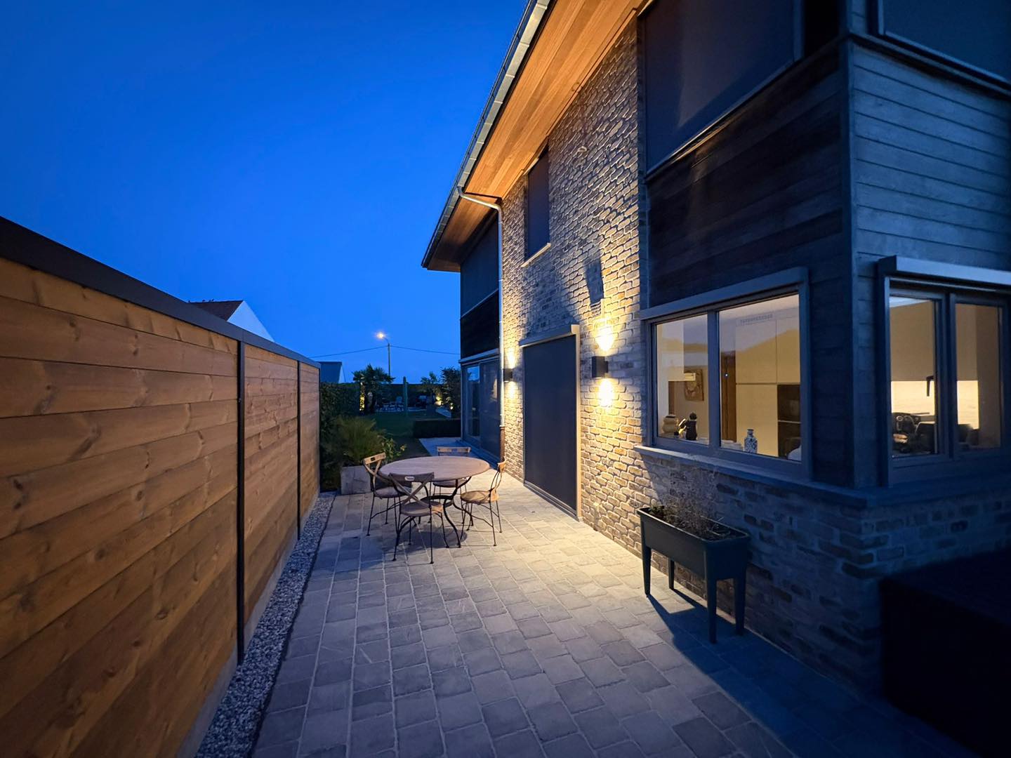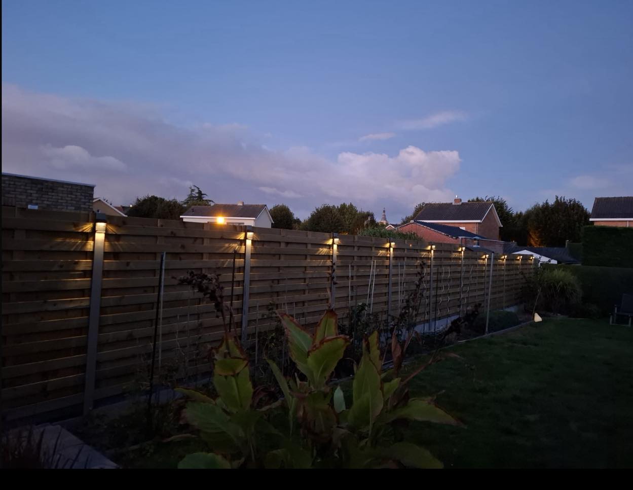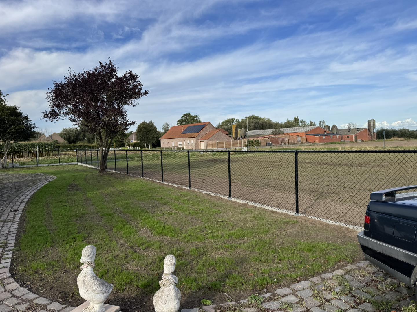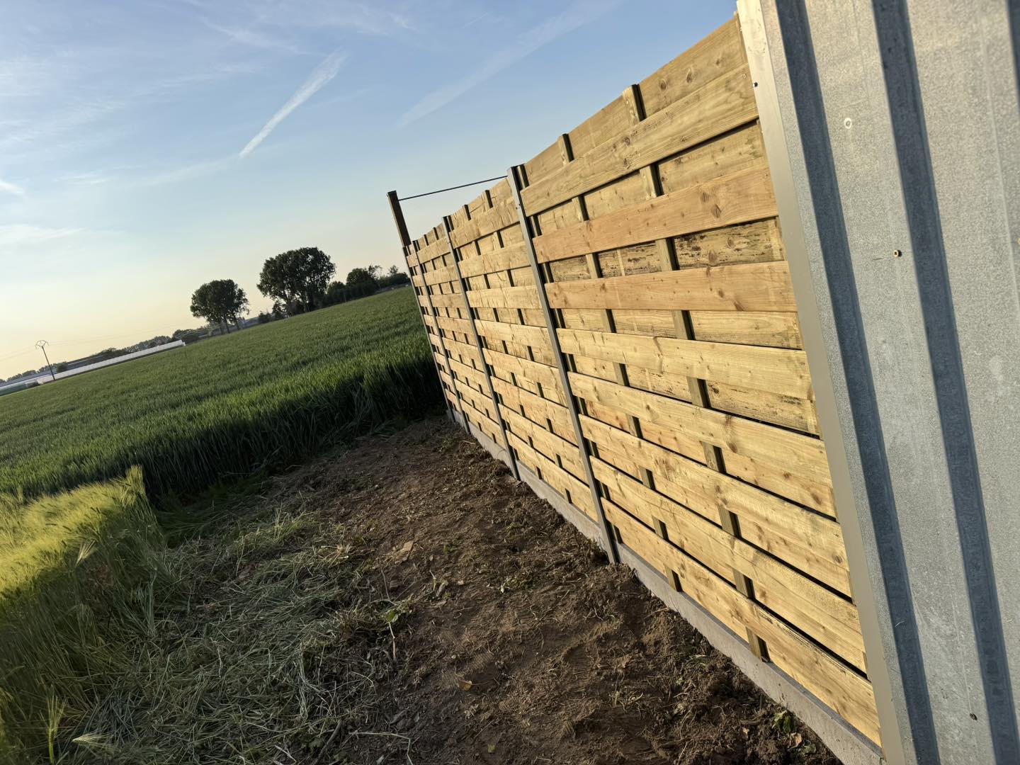 Nieuwe houten omheining en terras met wandelpaden te Gistel